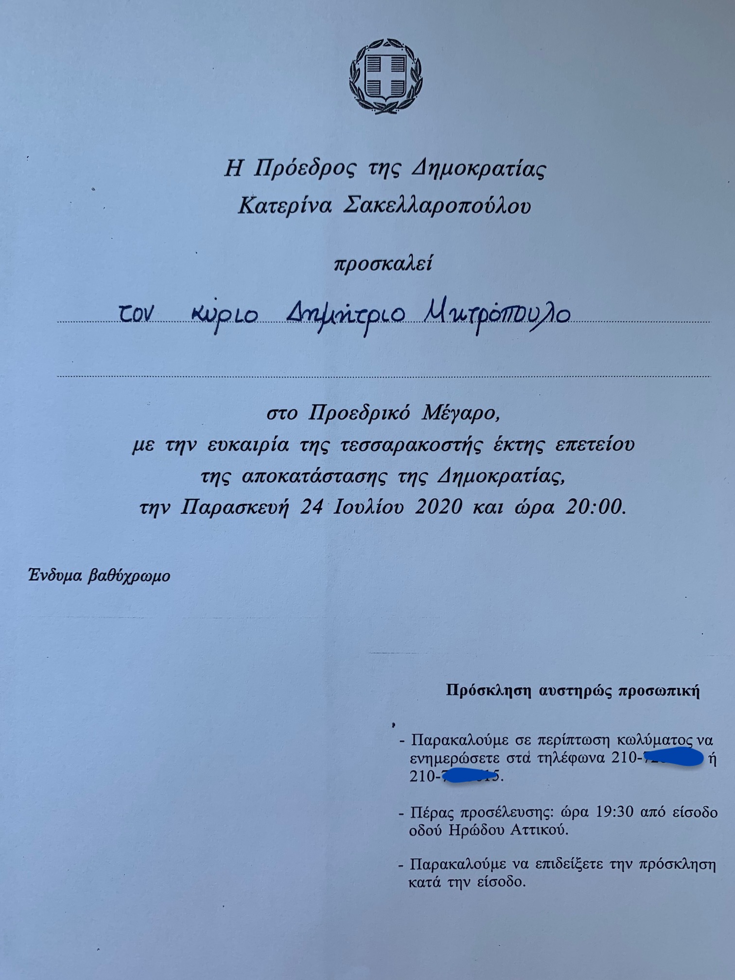 Attending the 46th Anniversary of the Restoration of Democracy in Greece, July 2020.