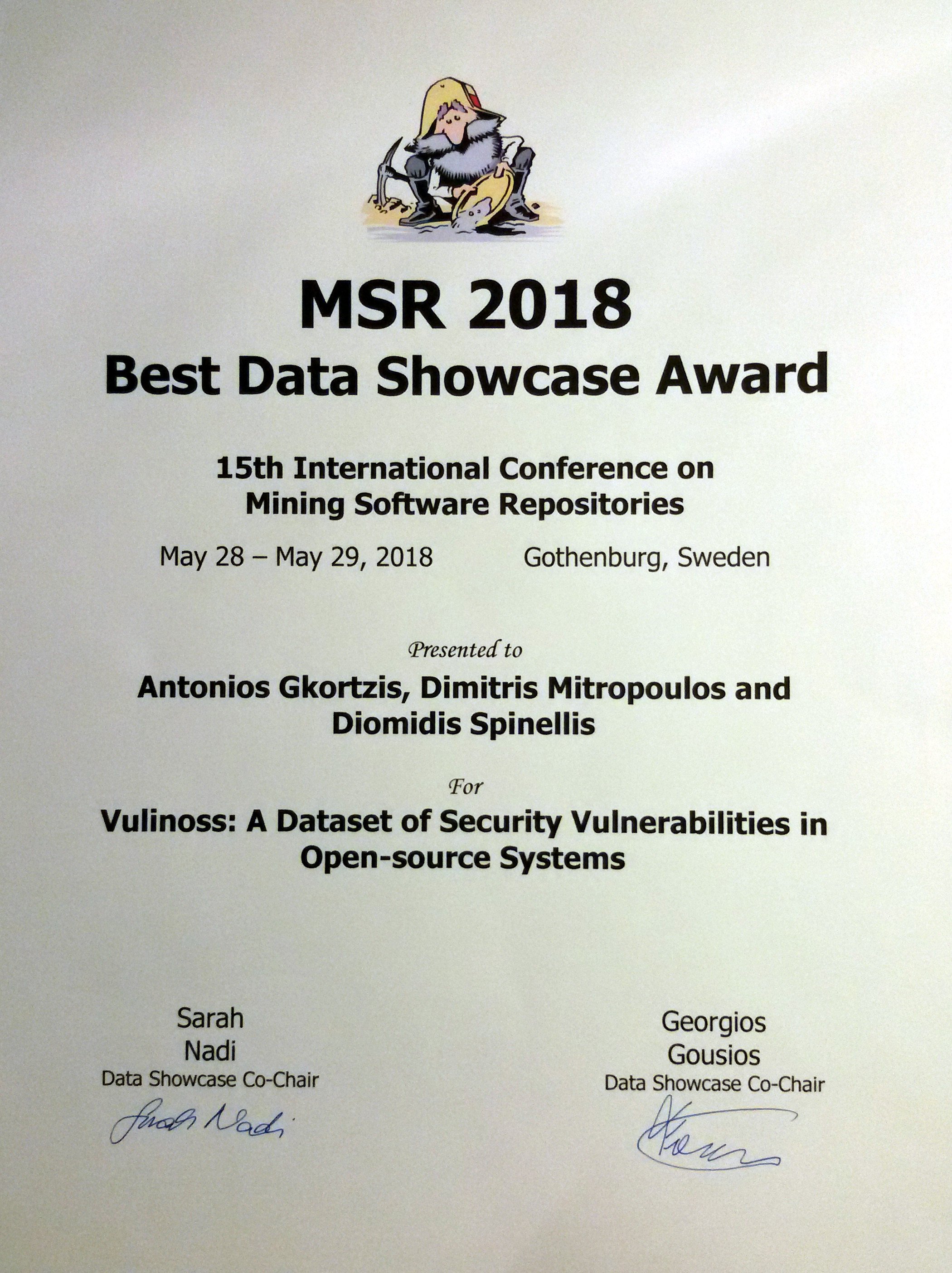 Our replication package for the paper VulinOSS: A dataset of security vulnerabilities in open-source systems received a Distinguished Artifact Award at the 15th International Conference on Mining Software Repositories (MSR ‘18). -