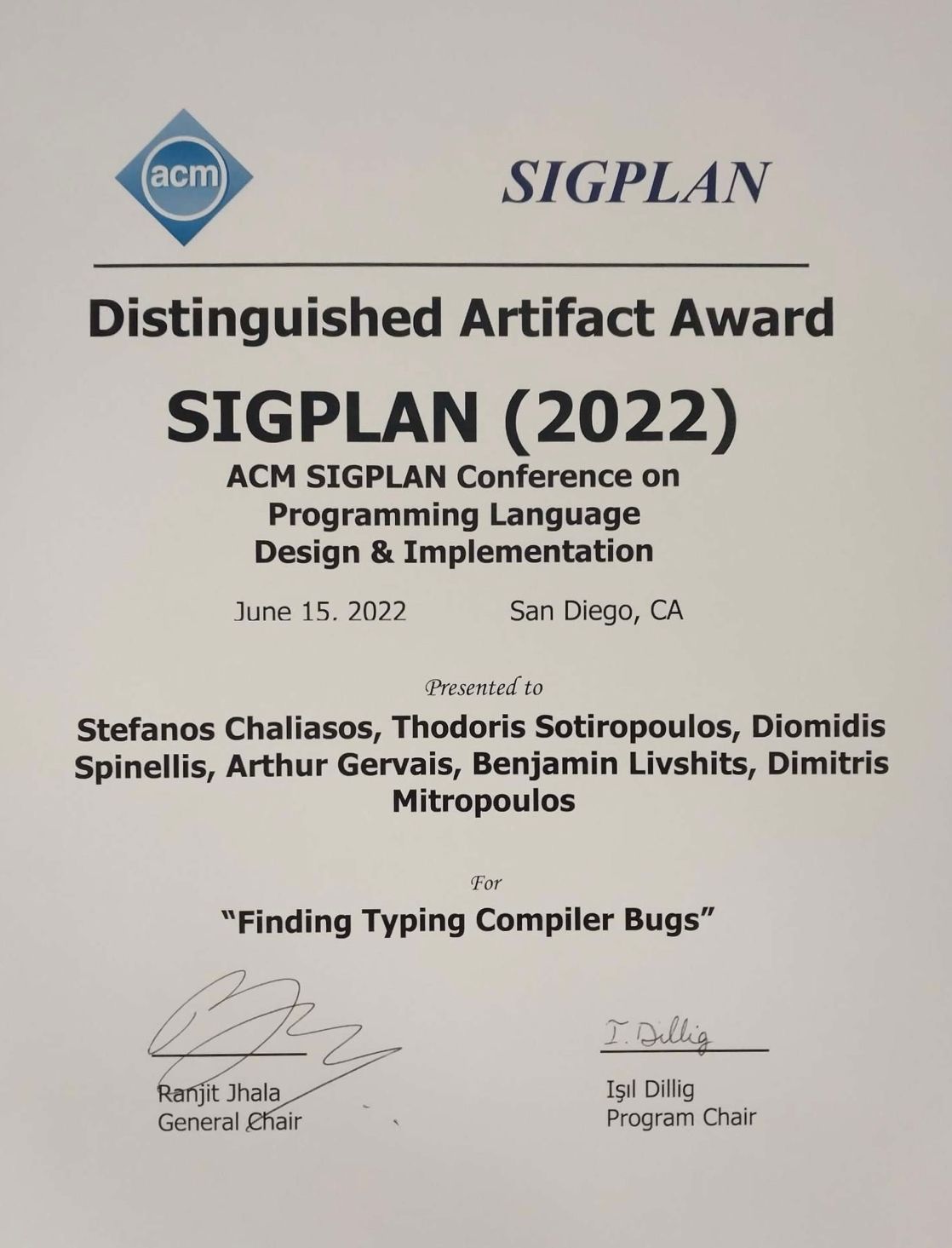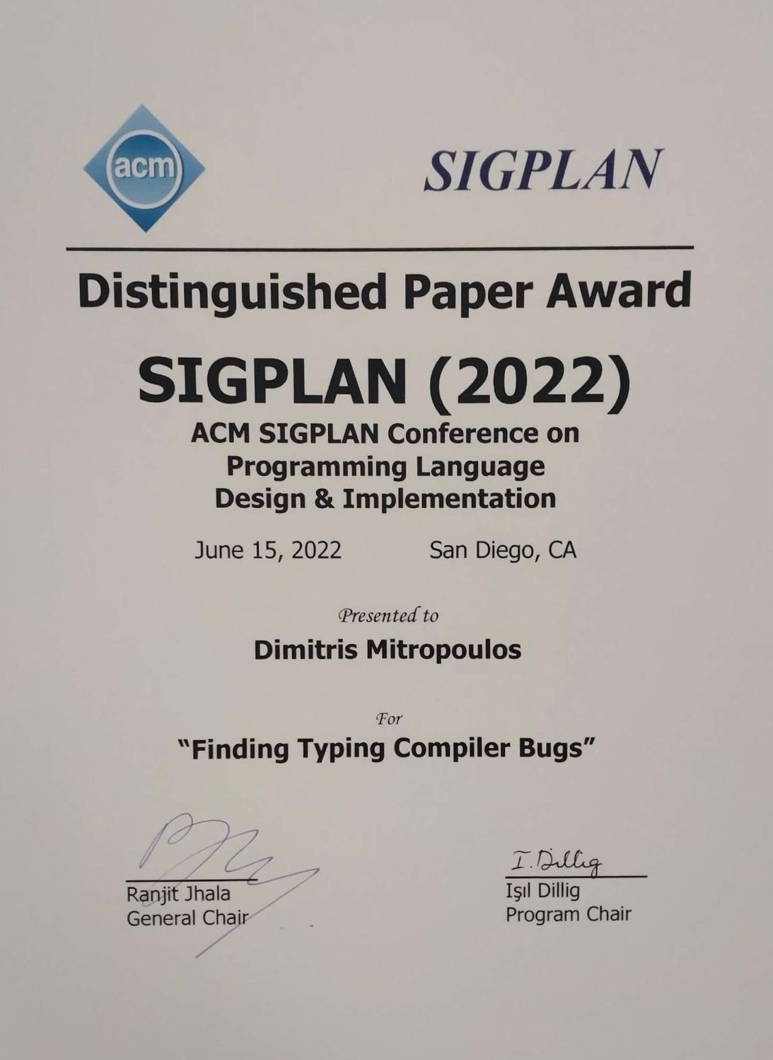 Our paper Finding Typing Compiler Bugs received a Distinguished Paper Award at the 43rd ACM SIGPLAN Conference on Programming Language Design and Implementation (PLDI ‘22). -